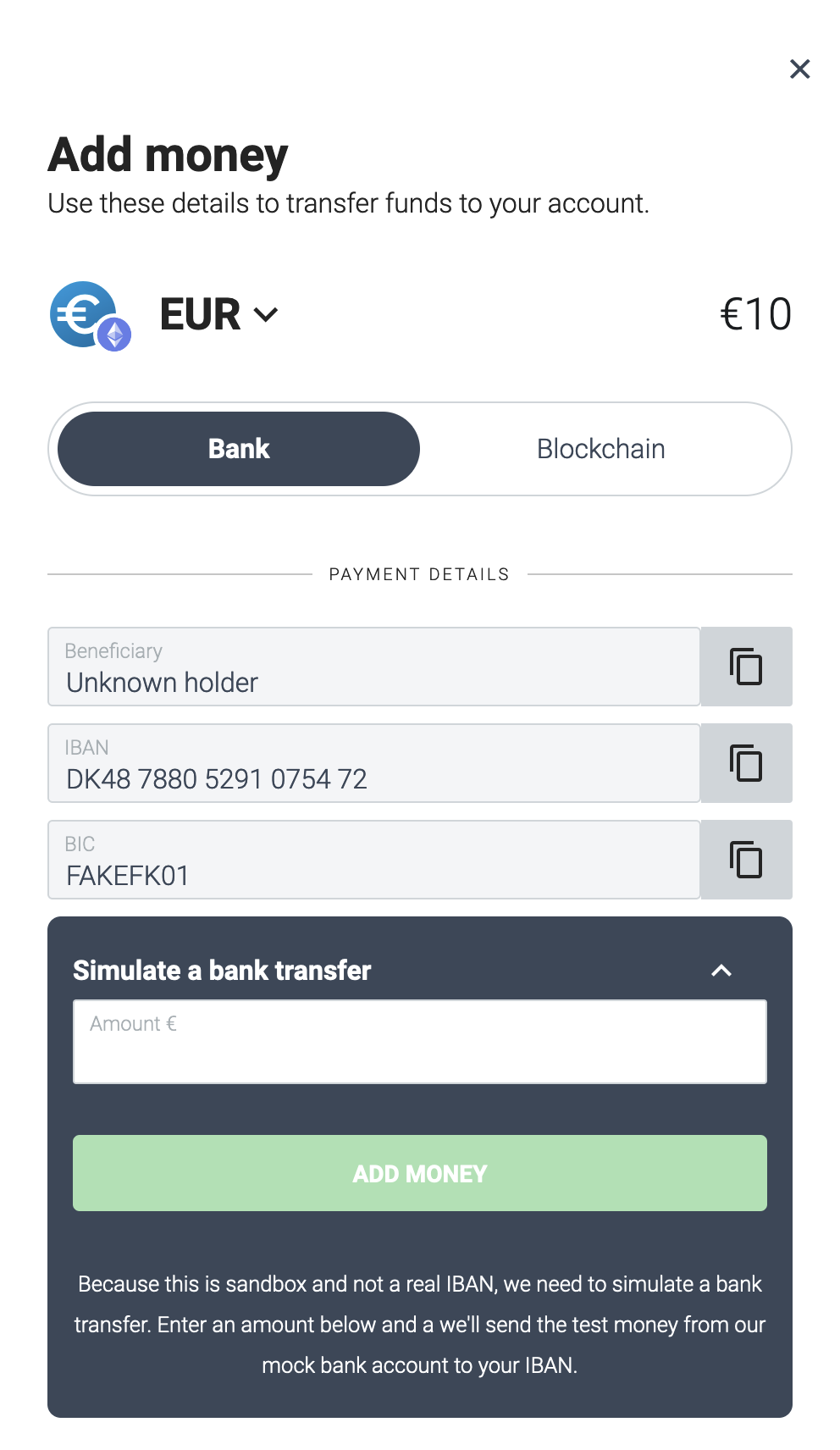 ADD MONEYbutton. - Create a test IBAN transfer onto the account. The tokens from this test transfer will be available in the Safe.